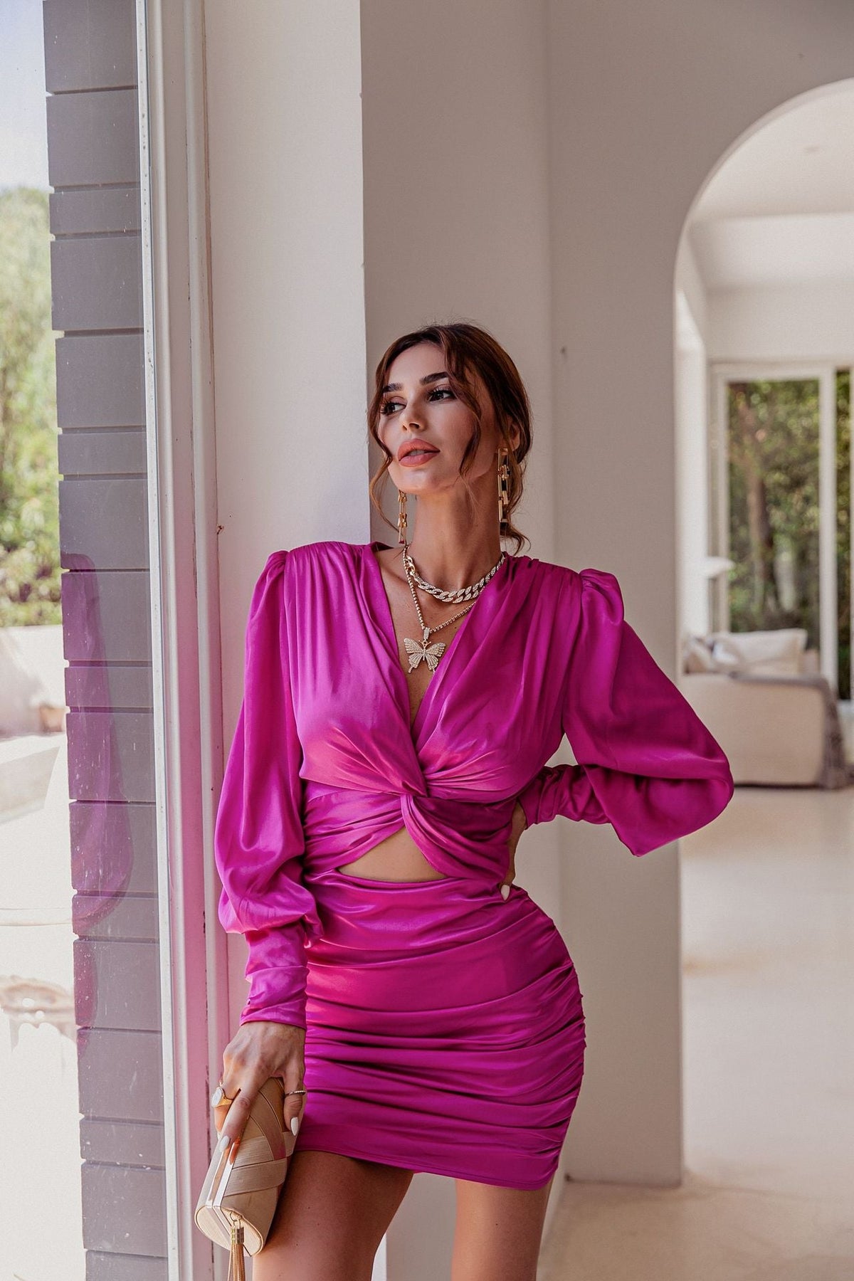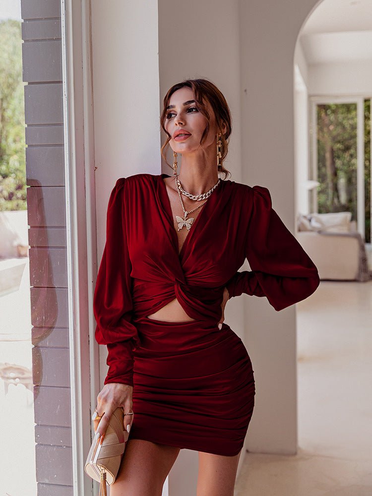 Deep V - neck Sleeve Satin Party Dress - Keven Kosh