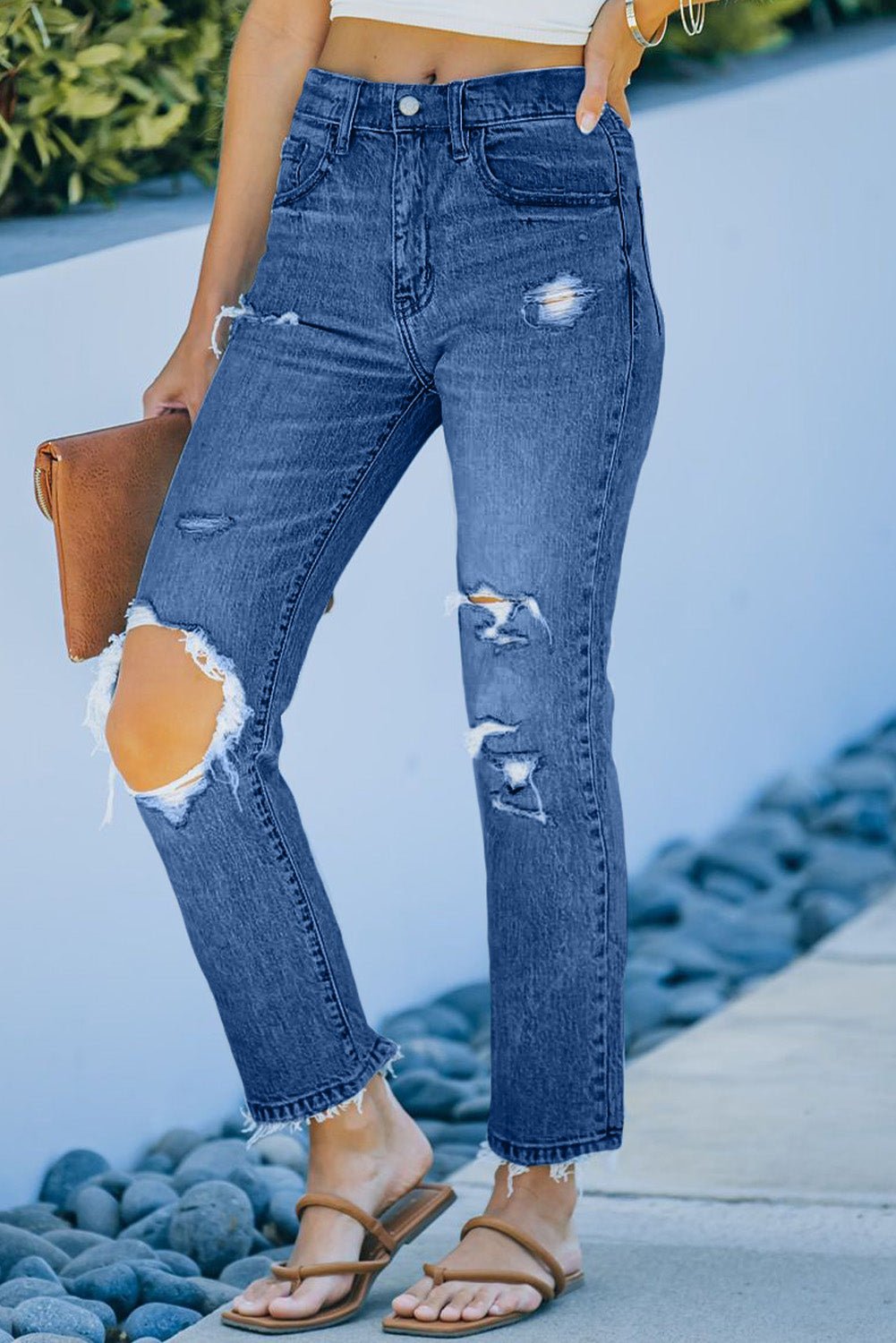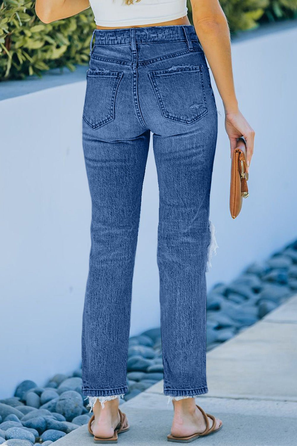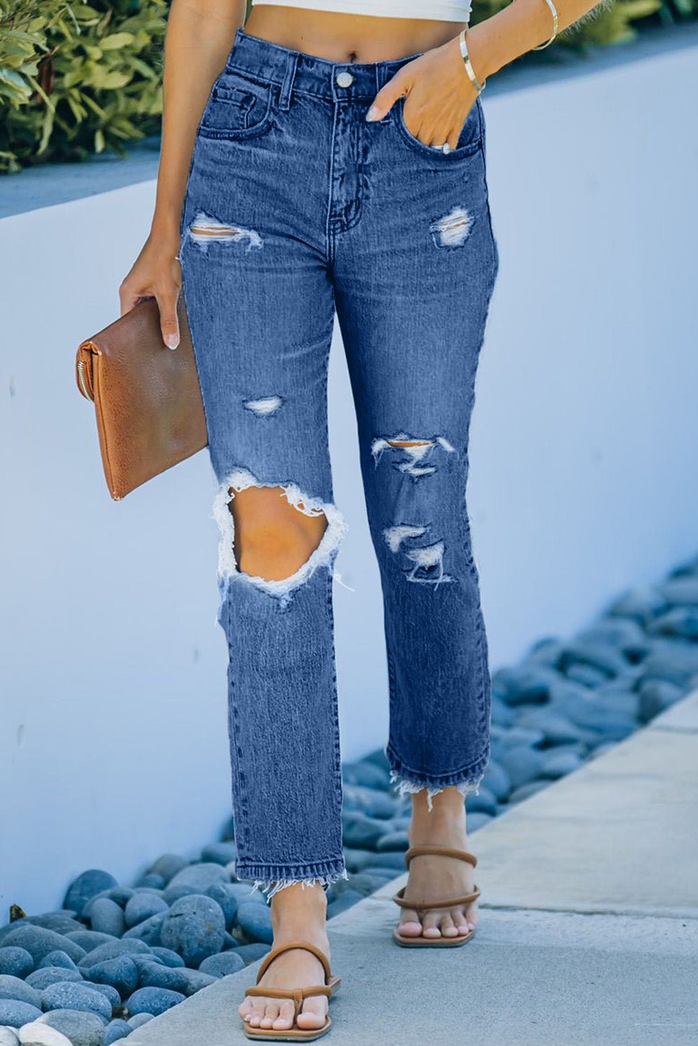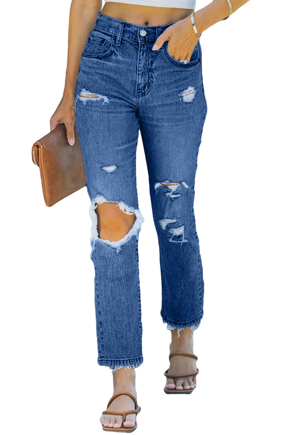 Dark Blue Distressed Holes Straight Jeans - Keven Kosh