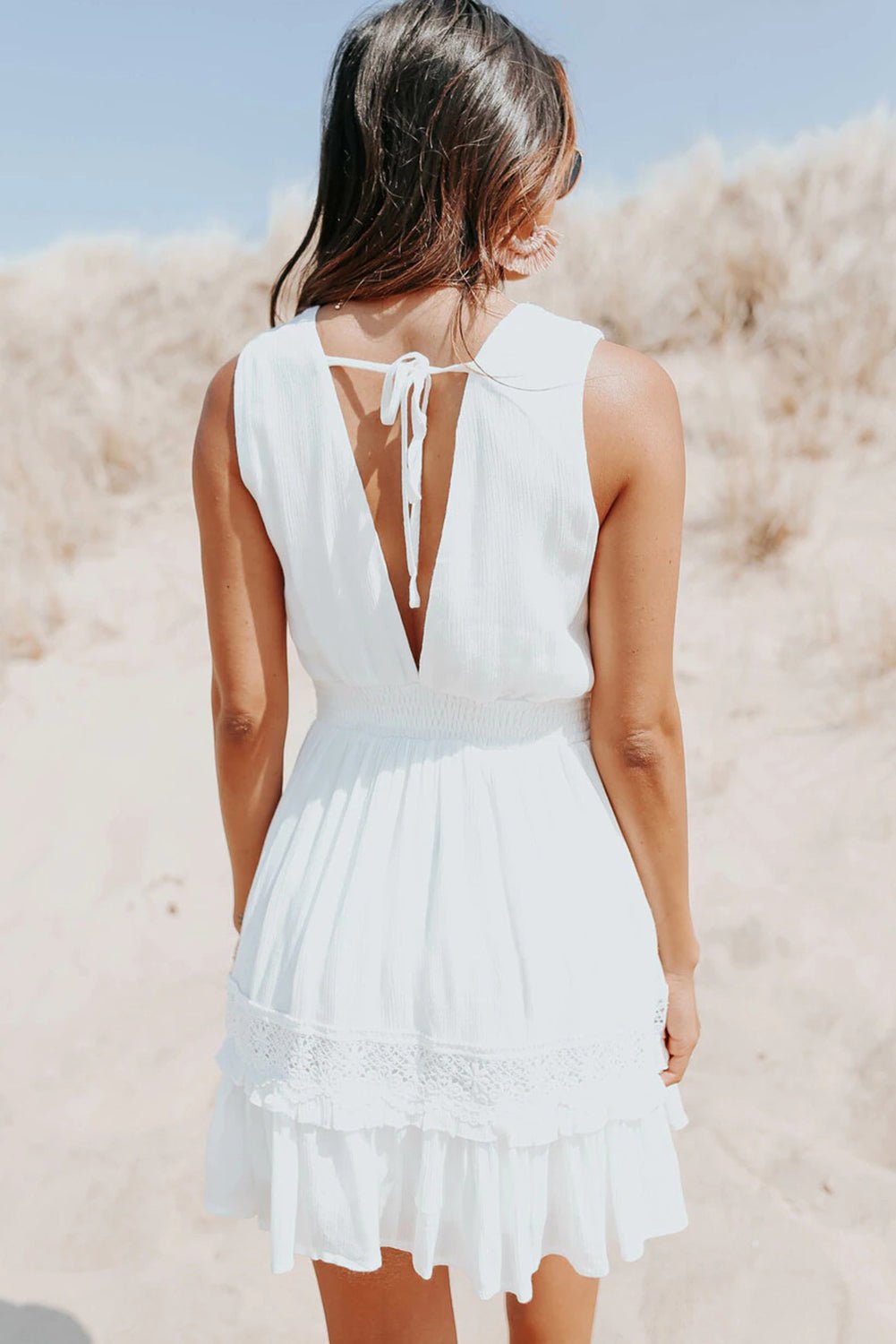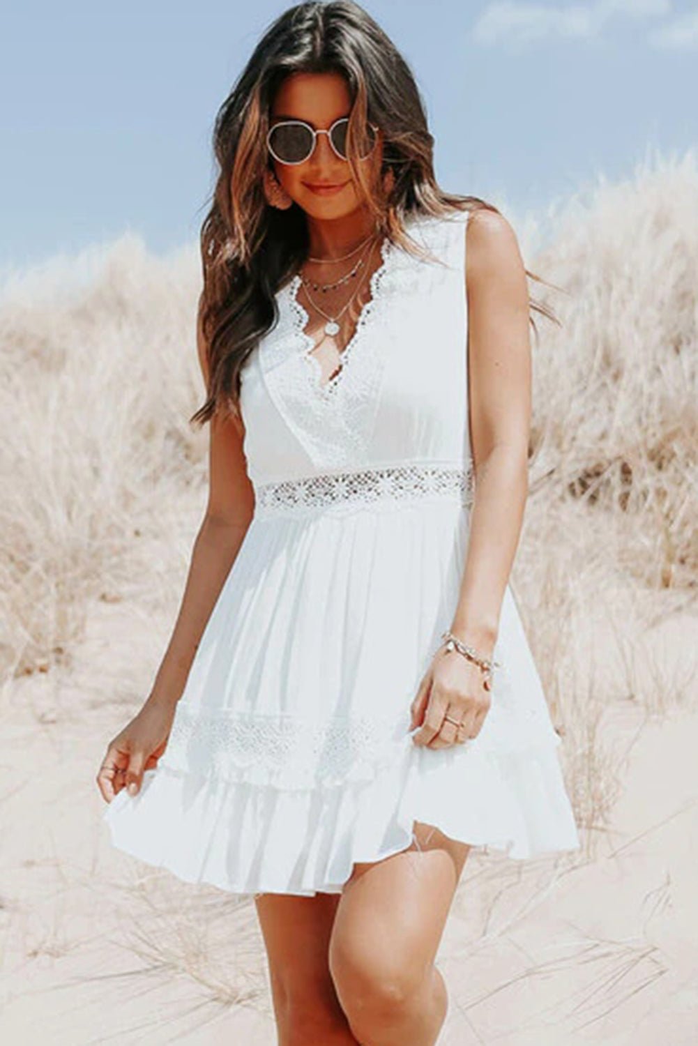 White Lace Crochet Flounce V Neck Sleeveless Mini Dress