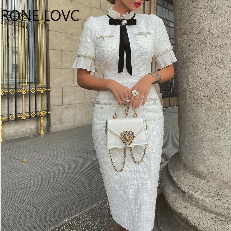 Women Elegant Round Neck Short Sleeves White Dress - Keven Kosh
